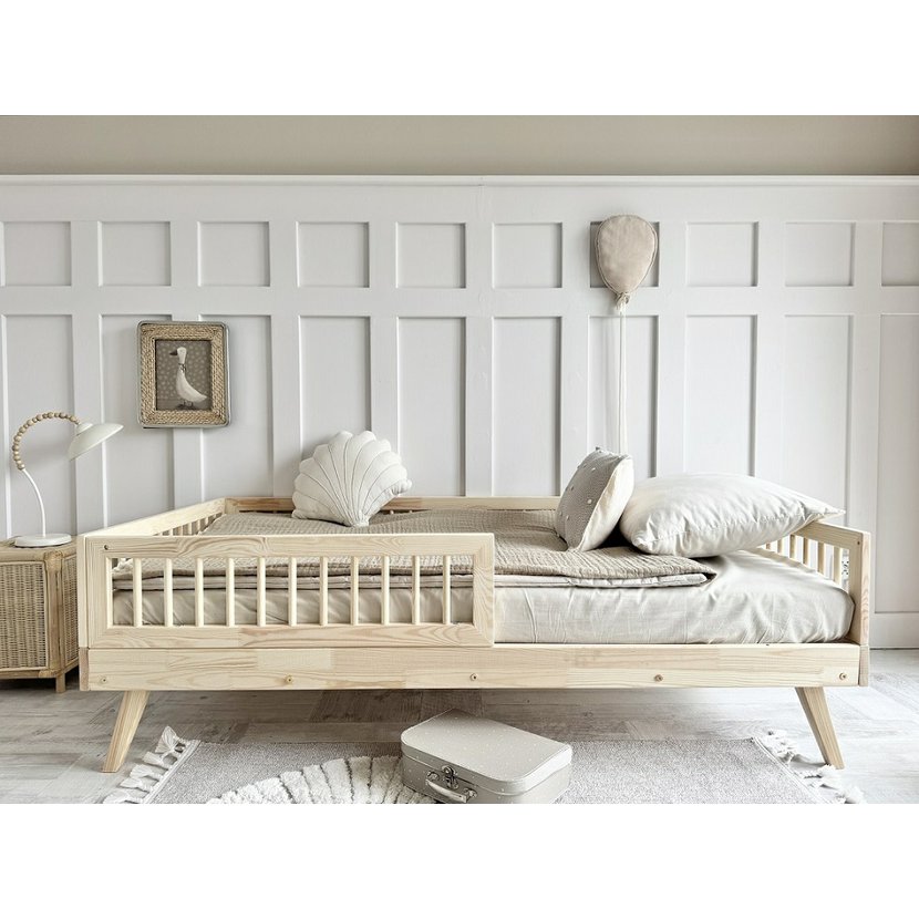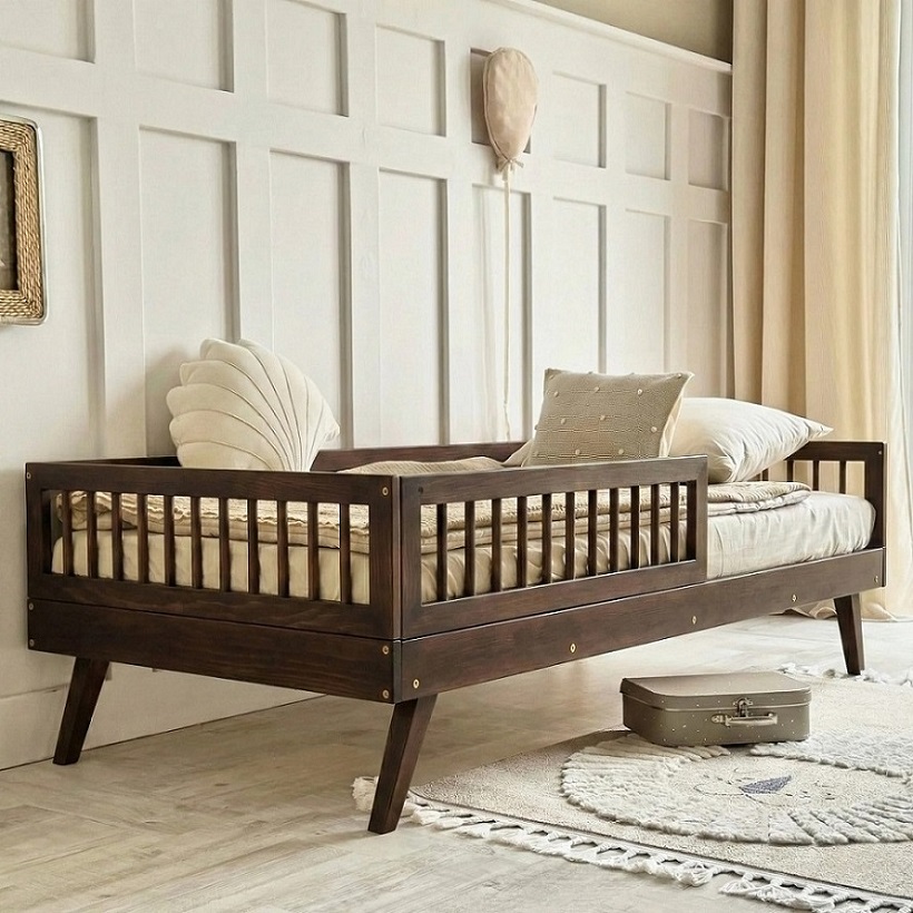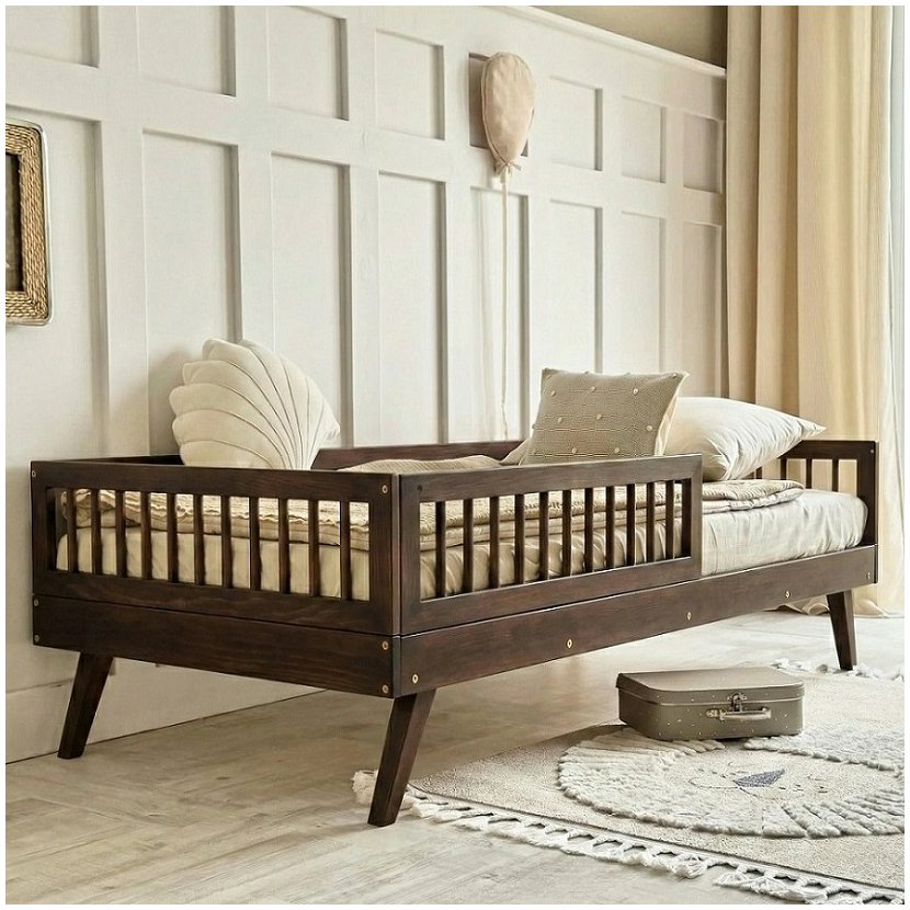 Detská posteľ VERTO v tmavom orechovom odtieni zaujme svojím elegantným a nadčasovým vzhľadom, ktorý dodáva detskej izbe teplú a útulnú atmosféru. Je vyrobená z vysoko kvalitného masívneho dreva, ktoré zaručuje vysokú pevnosť, stabilitu a dlhú životnosť aj pri každodennom používaní. Vďaka svojej konštrukcii a bočným mantinelom je posteľ bezpečná aj pre menšie deti, zatiaľ čo zaoblené hrany prispievajú k maximálnemu pohodliu. Posteľ obsahuje lamelový rošt a univerzálny predný mantinel, ktorý je možné namontovať na pravú alebo ľavú stranu. Tmavý orech je ideálnou voľbou pre rodičov, ktorí hľadajú kombináciu bezpečnej detskej postele a elegantného prírodného dizajnu.