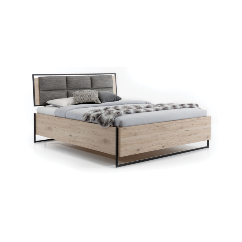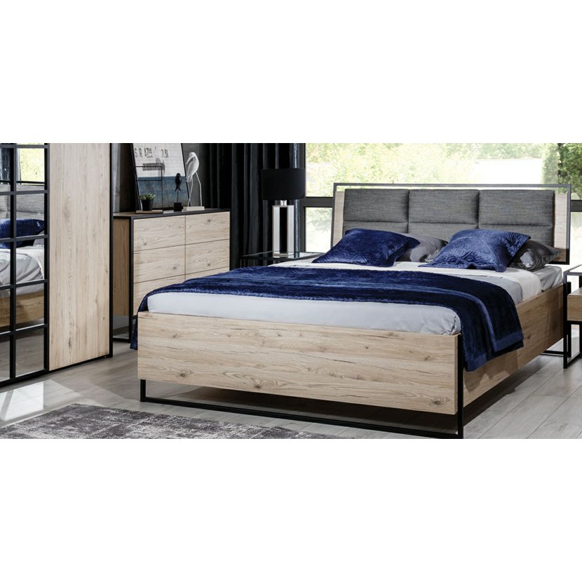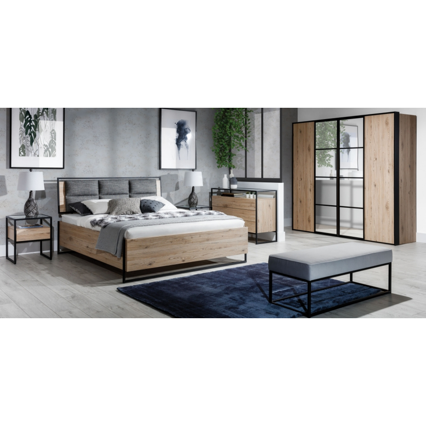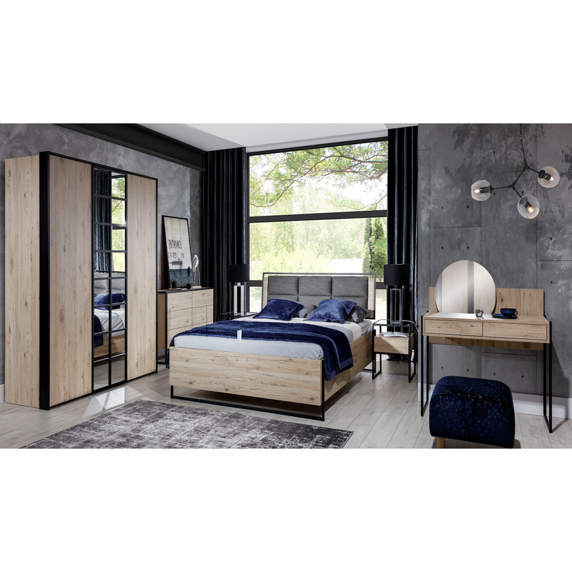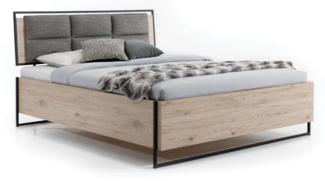 Veľkorysá posteľ Halle S s rozmermi 180 × 200 cm zaujme svojím výrazným industriálnym dizajnom, ktorý kombinuje dubový dekor wotan s čiernymi prvkami. Je vybavená výklopným lamelovým roštom v pevnom…