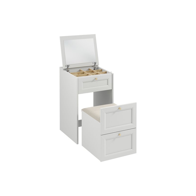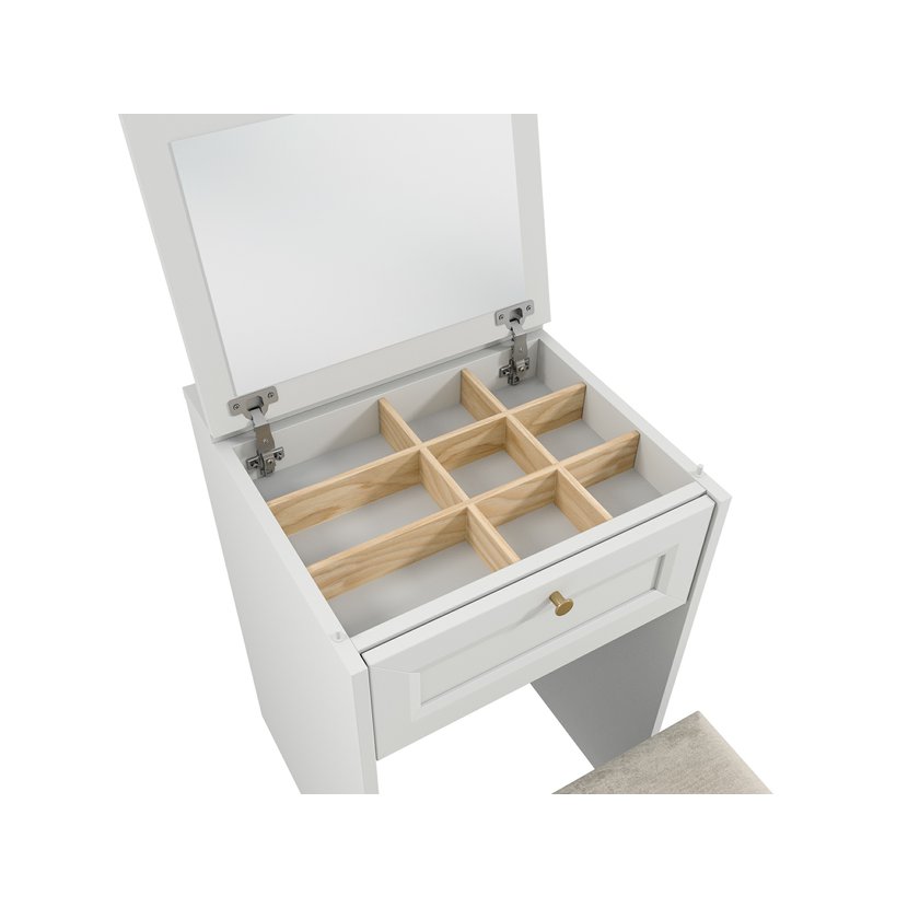 Toaletný stolík Zova v matnej kašmírovej farbe zaujme svojím sofistikovaným vzhľadom aj praktickosťou. Dve zásuvky s frézovanými čelami a integrovanými úchytmi poskytujú dostatok miesta na kozmetiku…