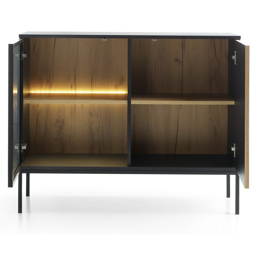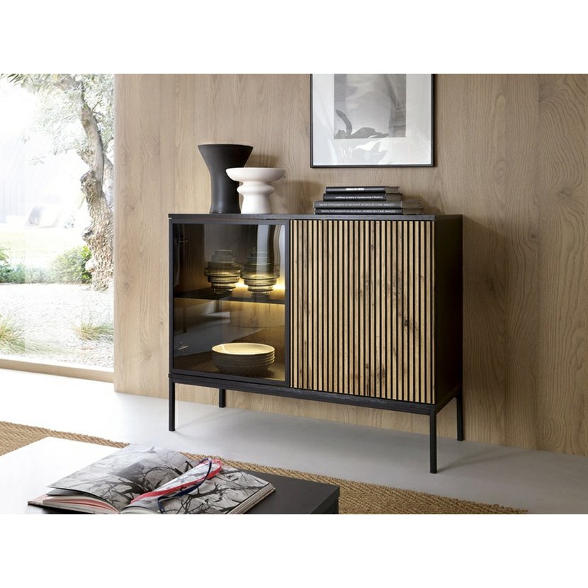 Moderná kolekcia nábytku Willow zaujme predovšetkým svojim dizajnom a spracovaním. Čierna v kombinácii s prírodným dubom sa bude vynímať v každom priestore. Na originalite dodajú dvierka s frézovaním.
