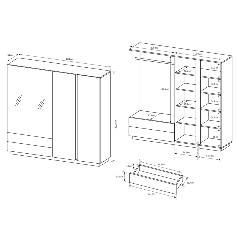 vnútorné usporiadanie: polica, šatníková tyč, 2x zásuvka