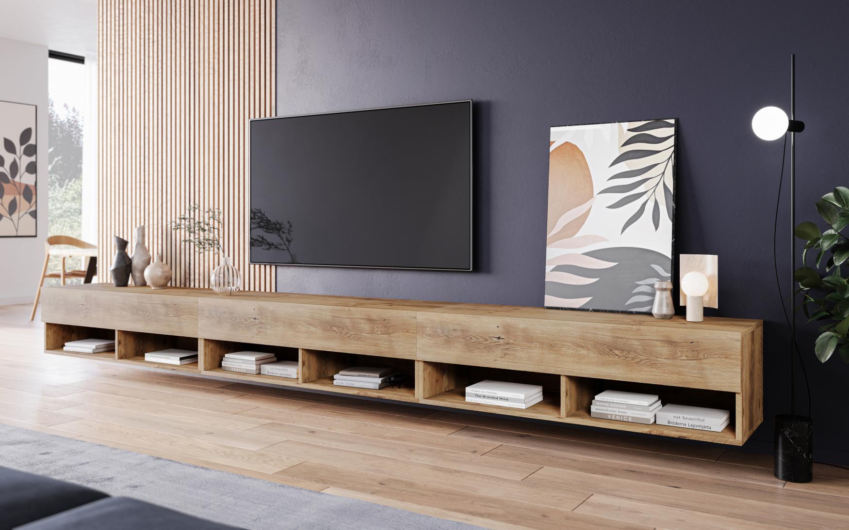 TV stolík Lowboard A 300 v dekore gaštan je moderné a praktické riešenie pre priestrannú obývaciu izbu. Skladá sa z troch samostatných skriniek, ktoré po zostavení vytvárajú celok s dĺžkou 300 cm. V hornej časti sa nachádzajú výklopné dvierka, spodnú časť tvoria otvorené police vhodné pre elektroniku, dekorácie alebo uloženie drobností. Stolík je možné zavesiť na stenu alebo postaviť na nožičky, pričom montážny materiál aj nožičky sú súčasťou balenia. Korpus je vyrobený z laminovanej drevotrieskovej dosky s hrúbkou 15 mm a doplnený odolnými ABS nábytkovými hranami. Čistý moderný vzhľad podčiarkuje bezúchytkový systém otvárania pomocou presahu dvierok cez okraj.