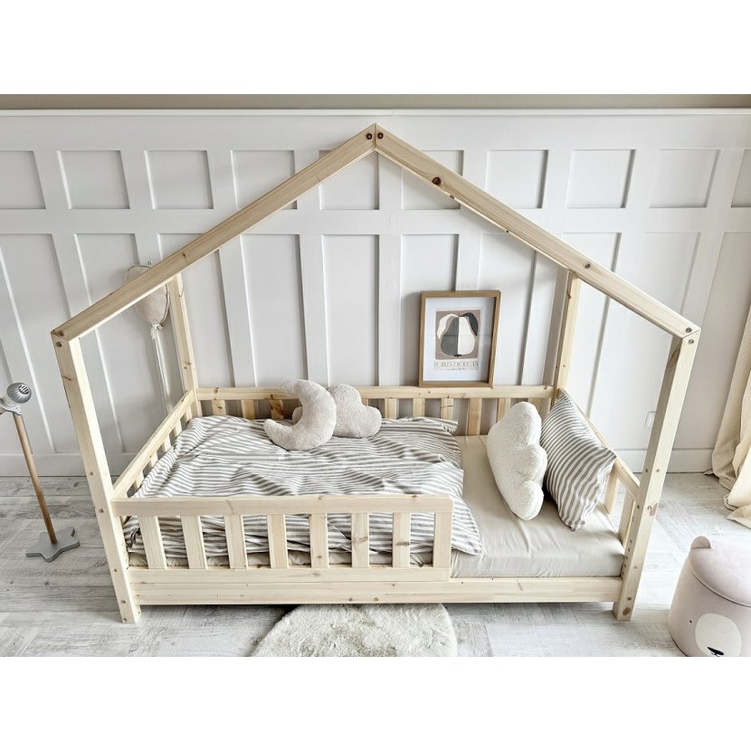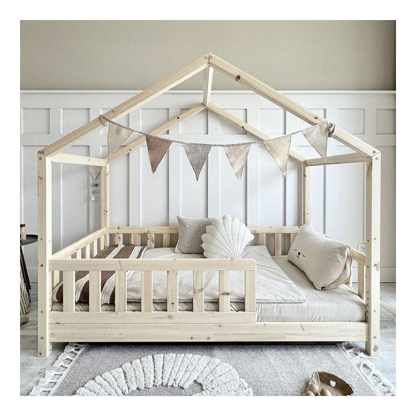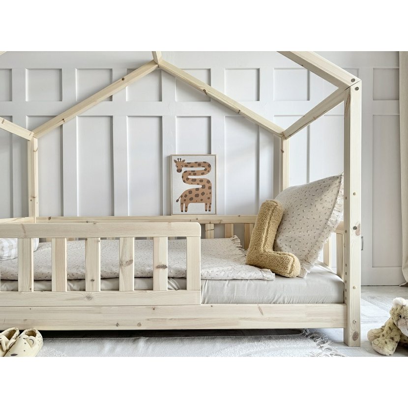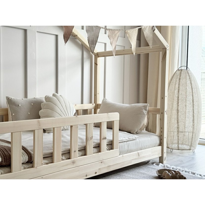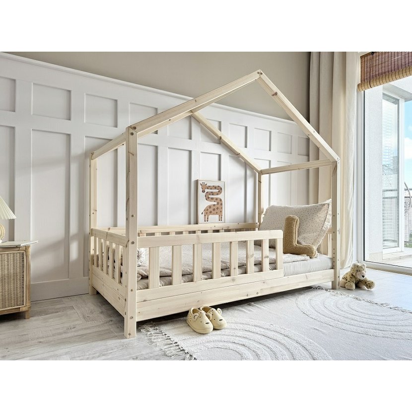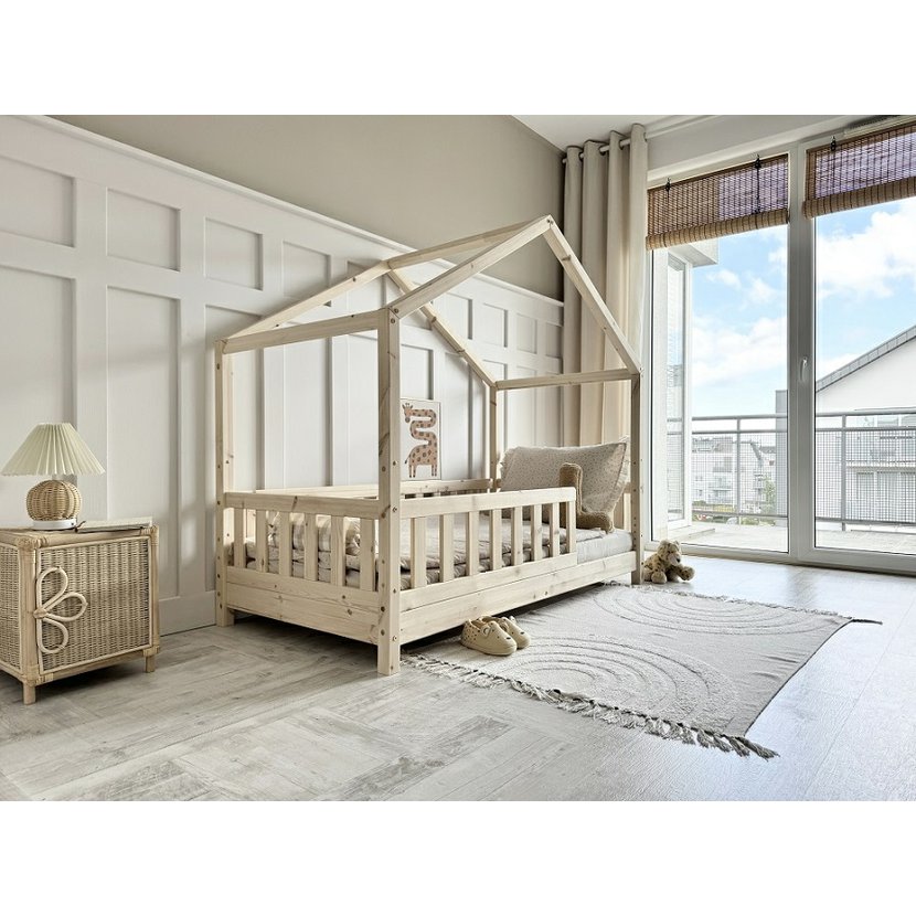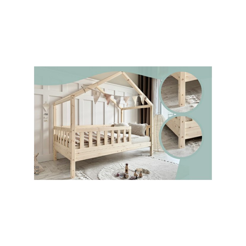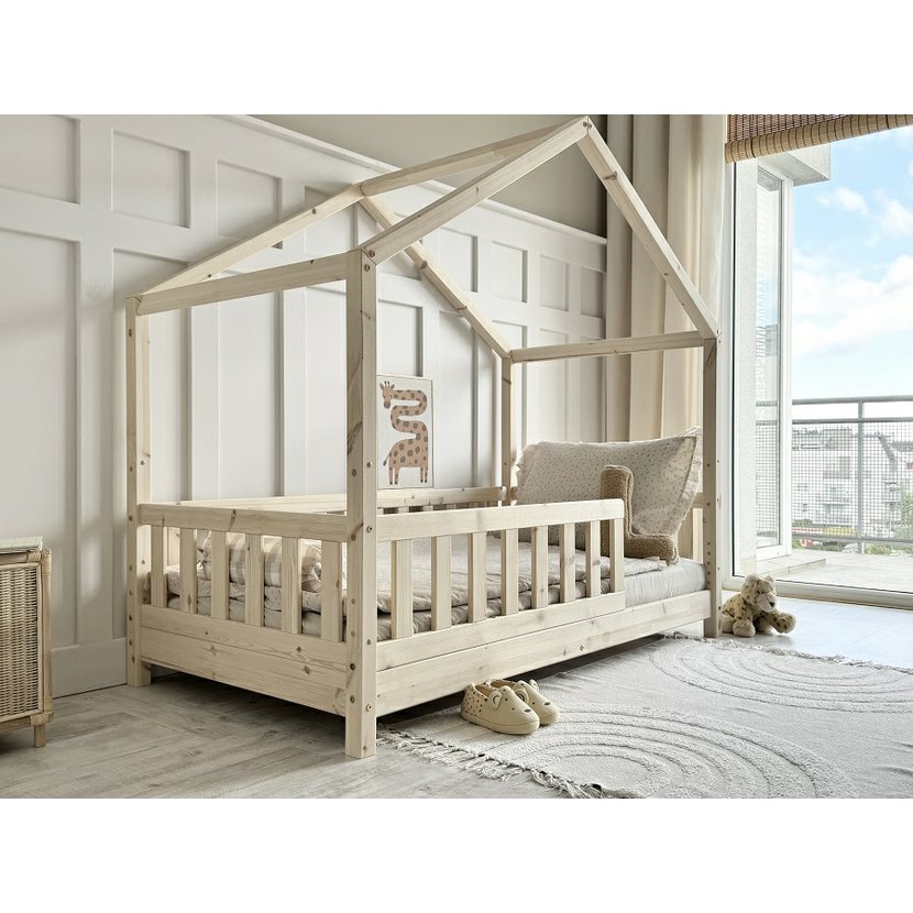 Domčeková posteľ Housebed Gabby z kolekcie Pure Wood s rozmermi 100 × 190 cm ponúka ideálnu kombináciu pohodlia, prírodného dizajnu a bezpečnosti. Je vyrobená z starostlivo vybraného borovicového dreva s krásne viditeľnými sukmi a jemnou kresbou, čo detskej izbe dodáva teplý, prírodný charakter. Stabilná konštrukcia v tvare domčeka podporuje kreatívnu hru a vytvára útulnú atmosféru pri spánku. Súčasťou je pevný lamelový rošt a bezpečnostná zábrana, vďaka čomu je posteľ vhodná aj pre menšie deti. Minimalistický škandinávsky štýl sa hodí do moderných aj prírodných interiérov.