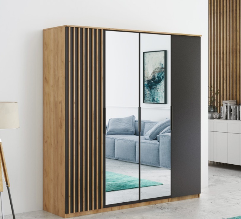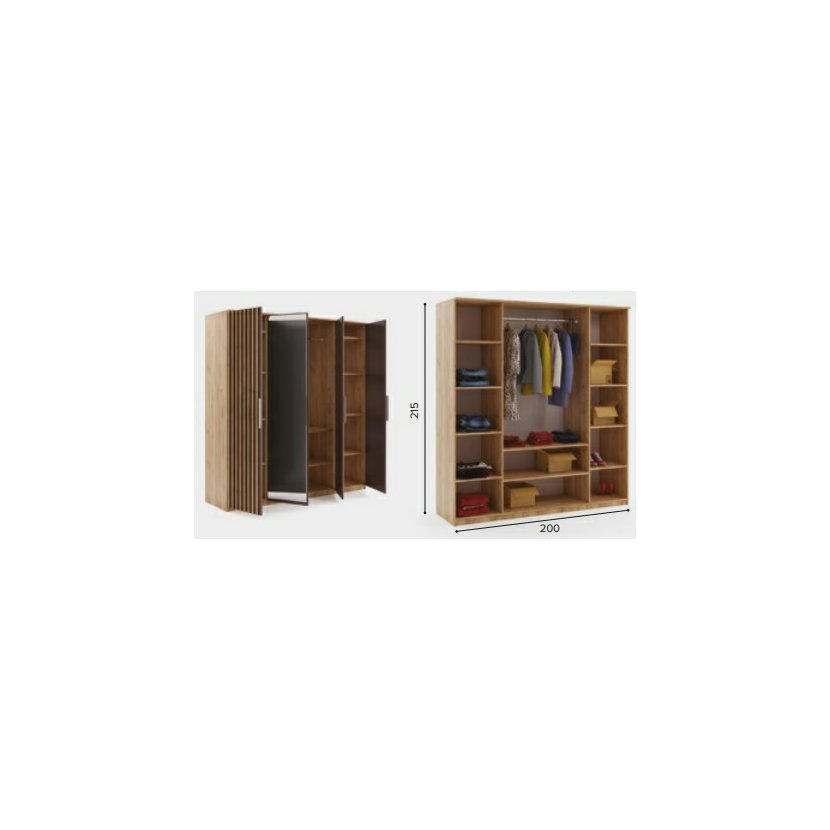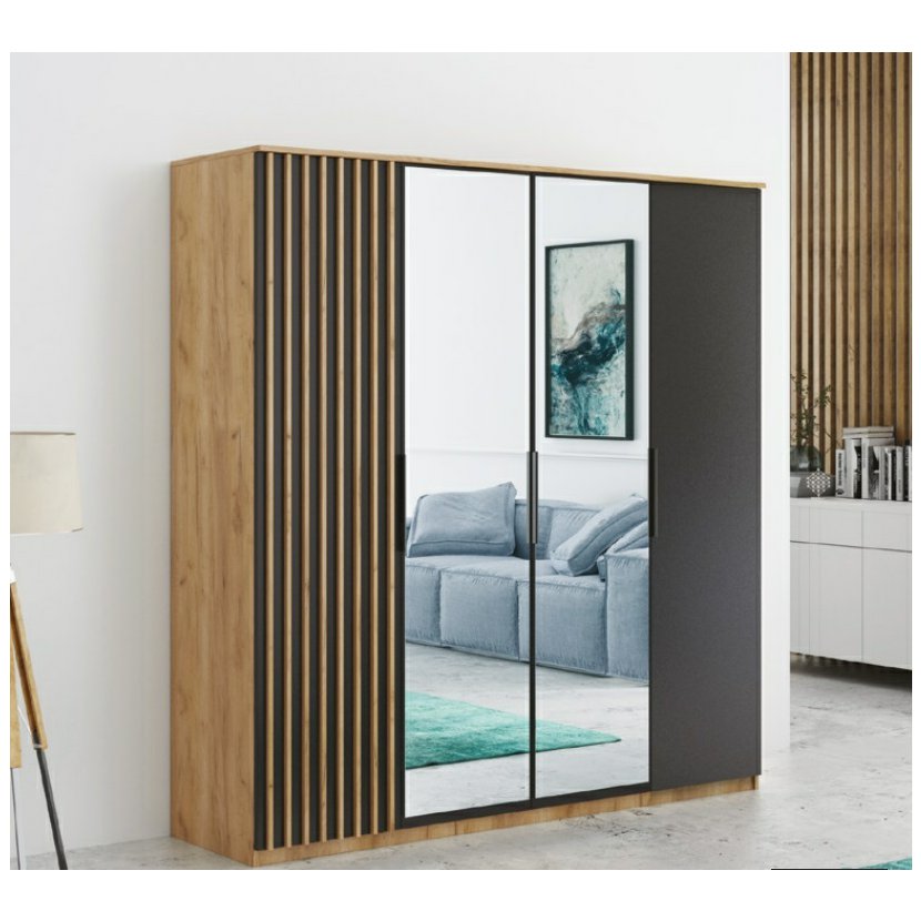 Šatníková skriňa Rocco v modernom dizajne je vyrobená z kvalitného lamina hrúbky 16 mm. Jedinečnou súčasťou tejto skrine je dokonale zvolené farebné prevedenie a štruktúra vo forme ozdobných lamiel.