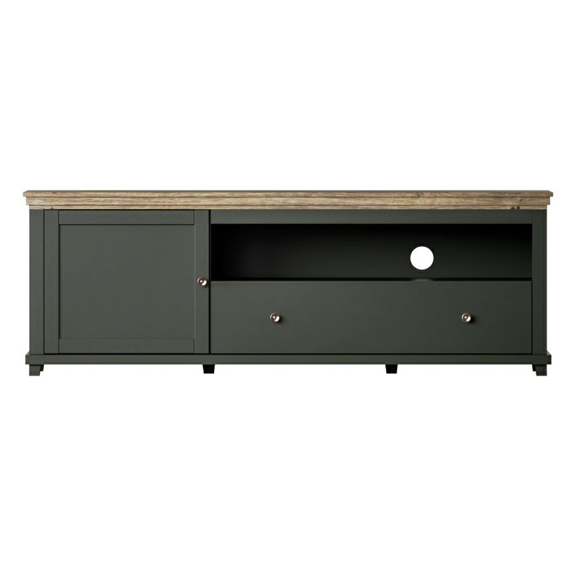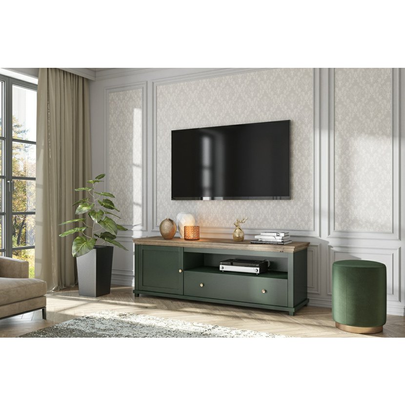Moderný televízny stolík Evora prináša do vášho interiéru kombináciu vidieckej elegancie a praktického usporiadania. Spojenie tmavozeleného korpusu a dreveného dekoru dubu lefkas pôsobí nadčasovo a útulne – kombinácia ako stvorená pre štýl Provence alebo rustikálnu klasiku.