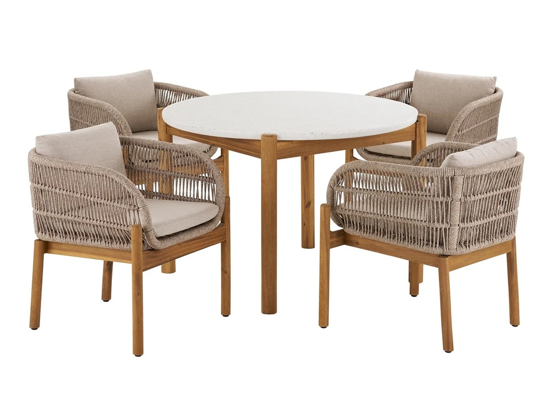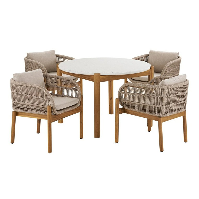 Elegantný záhradný jedálenský set TERRACINA spája prírodné materiály s nadčasovým dizajnom pre pohodlné a štýlové vonkajšie stolovanie. Set obsahuje jedálenský stôl a zodpovedajúce stoličky v jemnej béžovej farbe, ktoré sú vyrobené z kombinácie akáciového dreva a pevného lanového výpletu – ideálne na terasu, do záhrady alebo na zastrešené patio. Dizajn vystihuje severskú jednoduchosť a funkčnosť, vďaka čomu sa nábytok ľahko kombinuje s ďalšími vonkajšími doplnkami a vytvára príjemné prostredie pre letné obedy, posedenie s rodinou aj priateľmi. Je praktický, odolný voči poveternostným vplyvom a zároveň pôsobí štýlovo a elegantne v akomkoľvek exteriéri.