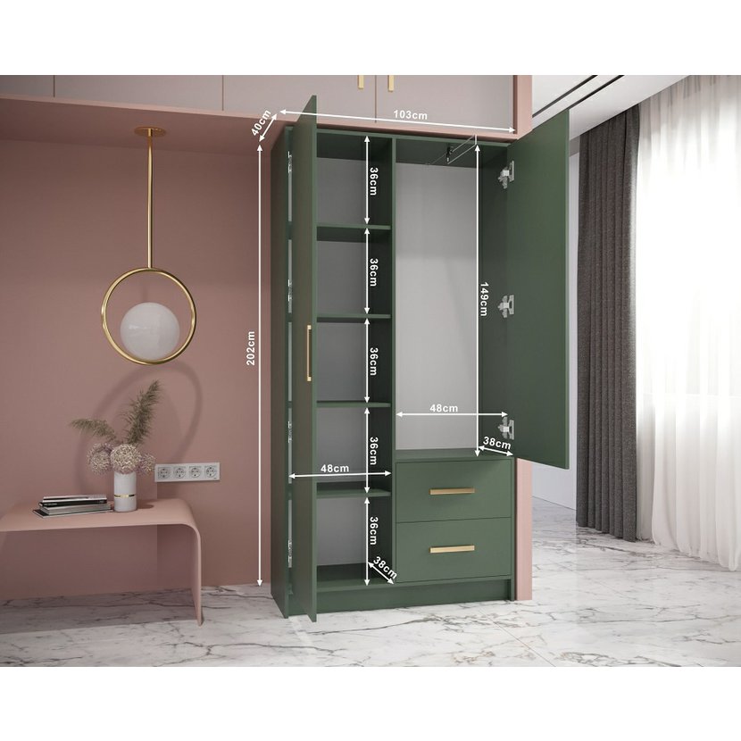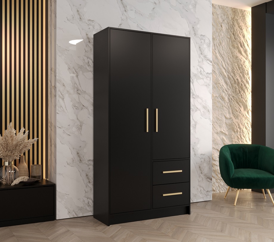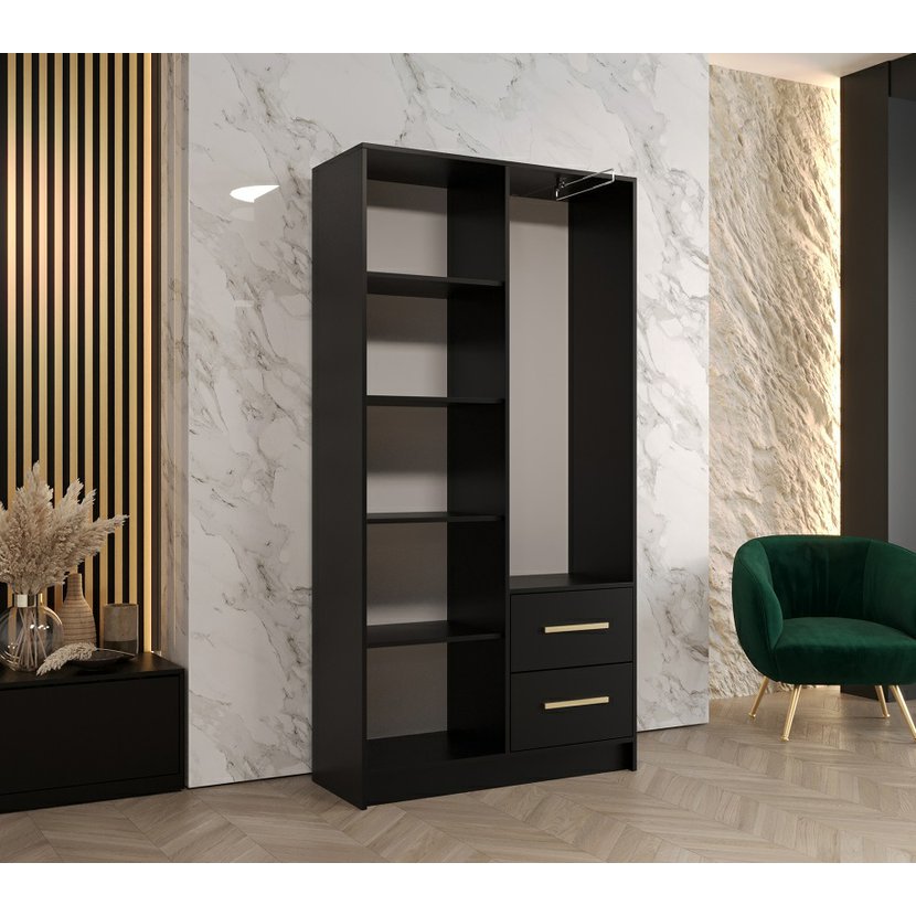 Čierna verzia štýlovej skrine Berlin zaujme na prvý pohľad čistými líniami a sofistikovaným dizajnom. Matné zlaté úchytky dodávajú skrini eleganciu a posúvajú ju na vyššiu úroveň v kolekciách nábytku. Kombinácia vešiaka na oblečenie, políc a zásuviek je vynikajúcou voľbou, pretože maximálne využíva priestor skrine.