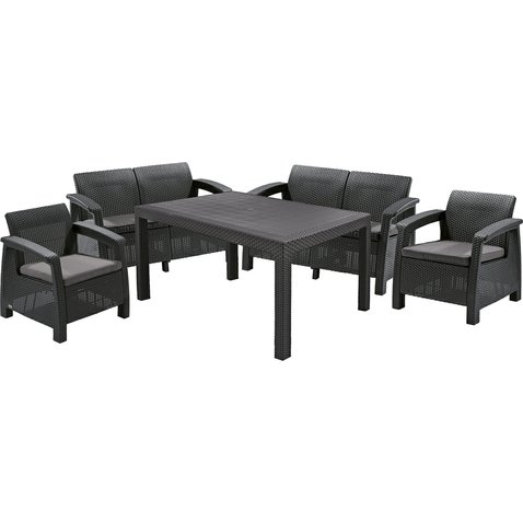 Corfu Fiesta je veľký set nábytku v imitácii prírodného ratanu, skladajúci sa z dvoch kresiel, dvoch dvojitých sofa a veľkého obdĺžnikového stola. Set je ideálny ako jedálenská súprava, ako do vonkajších, tak do vnútorných priestorov. Nábytok sa vyznačuje odolnosťou voči nepriaznivým poveternostným podmienkam a UV žiareniu. Corfu Fiesta je k dispozícii v niekoľkých obľúbených farebných kombináciách, vždy doplnených o pohodlné podušky. Veľkou výhodou je aj jednoduchá údržba a ľahké zostavenie súpravy.