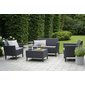 Elegantný set v imitácii ratanu, skladajúci sa z dvoch kresiel, dvojitého gauča a stola, ktorý navyše slúži ako úložný box. Produkt je dodávaný s pohodlnými poduškami v štýlových farbách. Ľahká a stabilná konštrukcia nábytku sa skvele hodí do exteriéru aj interiéru. Set je veľmi ľahký na údržbu. Výrobok je vysoko odolný proti UV lúčom a poveternostným vlyvom.